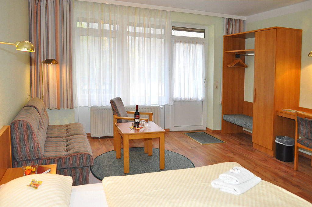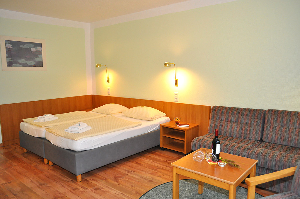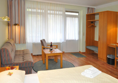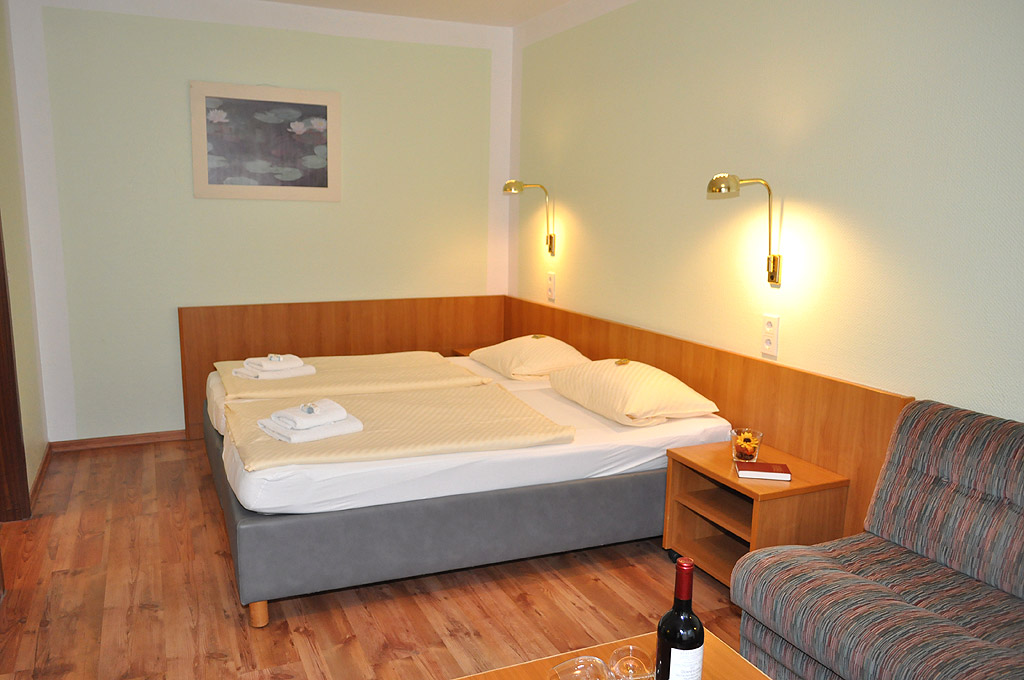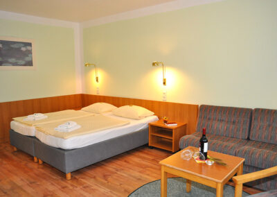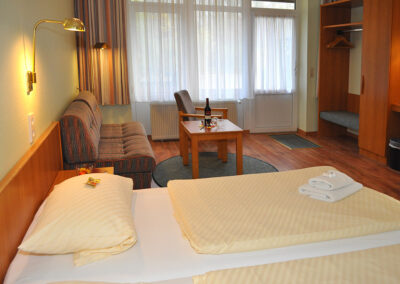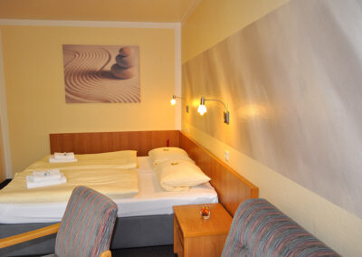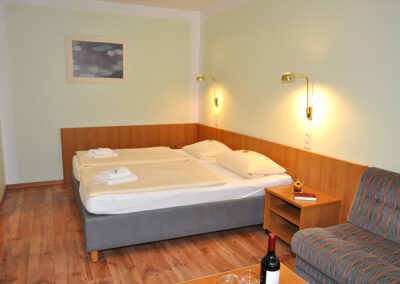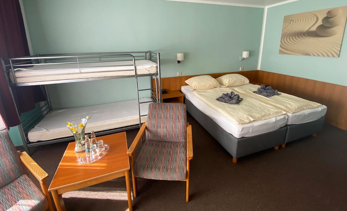 Ideal für Familien, die gemeinsam reisen und dennoch Komfort genießen möchten. Unsere Familienzimmer sind Doppelzimmer mit Aufbettung durch Etagenbett oder Schlafsofa und bieten Platz für bis zu vier Personen. Perfekt, um den Urlaub zusammen zu verbringen und sich gleichzeitig wohlzufühlen.